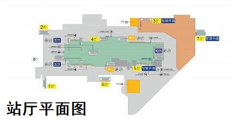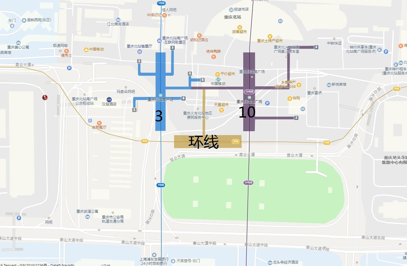 下面就是重庆北站南广场地铁站的站点平面图,上面说明了这个站点的换乘结构。