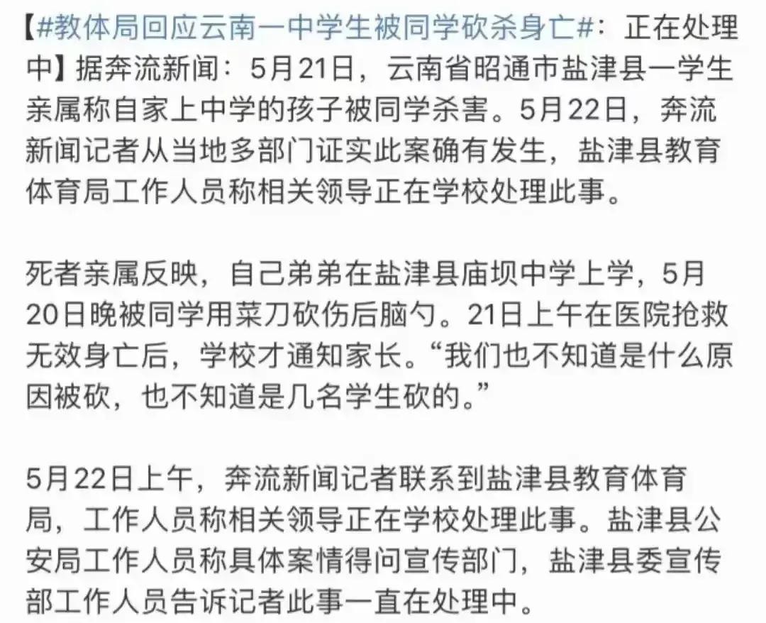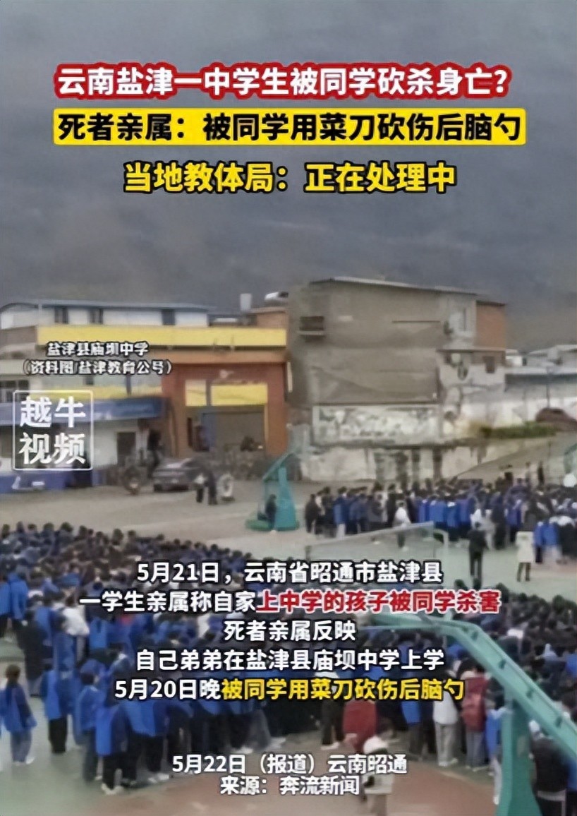 5月20日,一个本应充满爱意的日子,却在云南昭通市盐津县的庙坝中学上演了一出令人痛心的悲剧。一名中学生在校园内被同学用菜刀砍伤,伤及后脑勺,伤口之深令人难以直视。事件发生后,学校并未立即通知家长,而是等到第二天学生在医院因伤势过重抢救无效去世后,才告知家长这一噩耗。家长在悲痛中感到愤怒与无奈,他们对学校的沉默感到不解和不满。