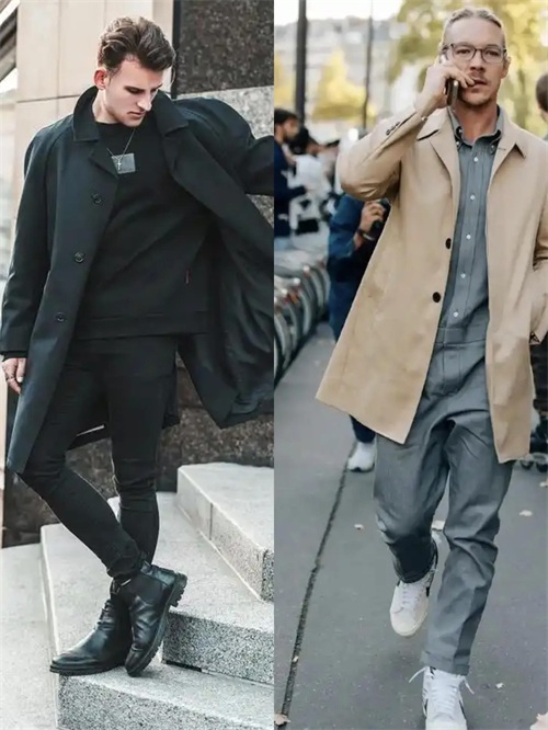 再来说说鞋子的搭配。皮鞋是搭配风衣很经典的选择,黑色或棕色的皮鞋能让整体造型更显正式。如果是休闲场合,休闲鞋也是不错的选择,白色运动鞋搭配卡其色风衣,会有一种青春活力的感觉。而马丁靴搭配黑色或军绿色风衣,则会显得很有型,很适合喜欢个性风格的男士。