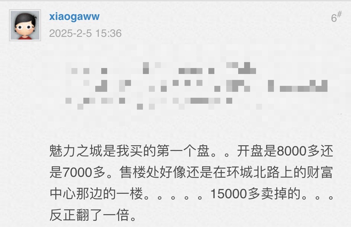 网友“xiaogaww”说:“魅力之城是我买的第一个盘,开盘是8000多还是7000多。售楼处好像还是在环城北路上的财富中心那边的一楼。后来15000多卖掉的,反正翻了一倍。”