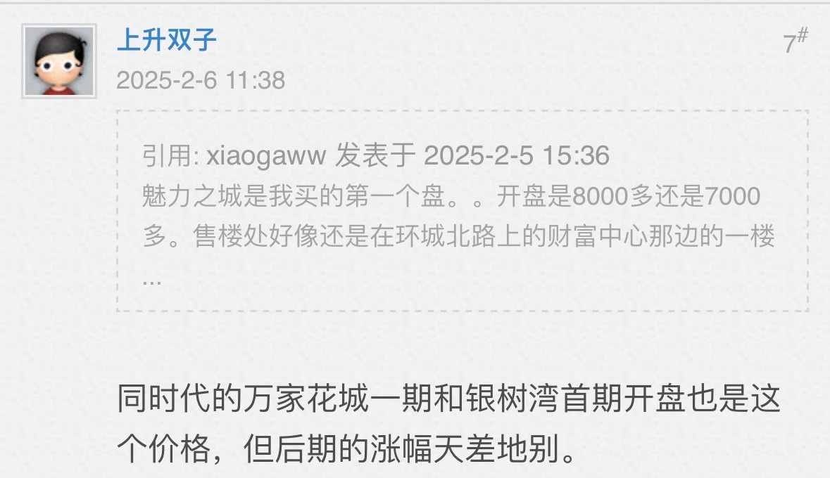 对于上面这位网友的经历,楼主也进行了回复:“同时代的万家花城一期和银树湾首期开盘也是这个价格,但后期的涨幅天差地别。”