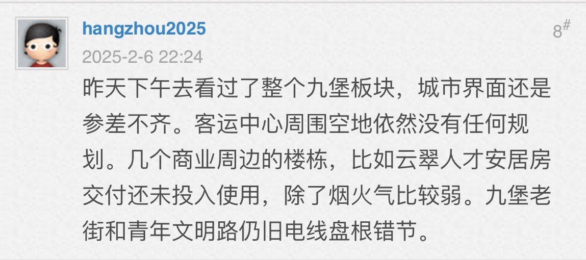 还有一位网友刚去看了九堡板块后点评:“城市界面还是参差不齐。客运中心周围空地依然没有任何规划。几个商业周边的楼栋,比如云翠人才安居房交付还未投入使用,除了烟火气比较弱。九堡老街和青年文明路仍旧电线盘根错节。”