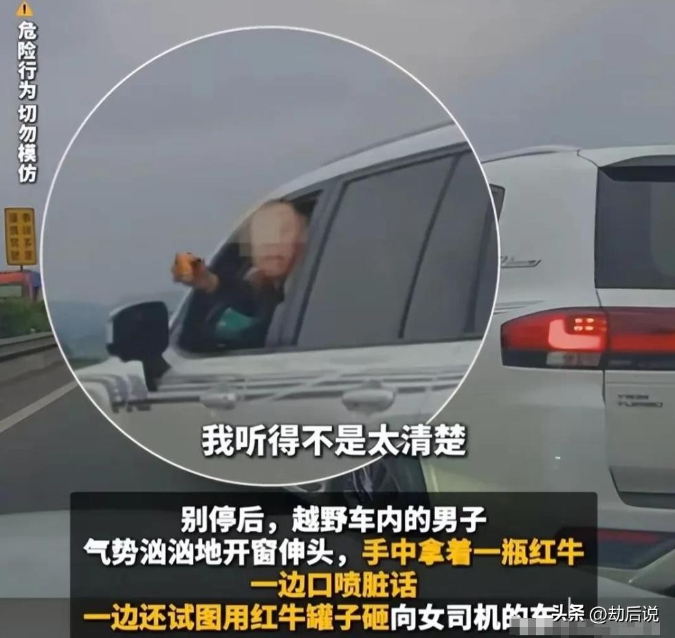 视频显示,越野车司机开窗伸头,朝着后车气势汹汹地疑似骂脏话,并举起饮料瓶试图砸向后车。刘女士一时被骂的有点懵。喊话:120 公里慢了吗?