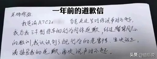 交警介入,嚣张车辆和司机很快被找到。也很快“认怂”。向交警表示会亲自给刘女士道歉。刘女士没等到亲自道歉,只收到了交警转来的一封手写道歉信。信里写道:“老师,你好!我是某某车主,因为别车的事,向你说声对不起。如今在交警普法教育下,我已认识到高速别车的严重性,以后会改,再次说声对不起。”落款日期是3月22日,“字迹工整”,“称呼谦逊”诚意满满的一封道歉信。本着“得饶人处且饶人”毕竟没造成实质伤害,刘女士原谅了这个司机。