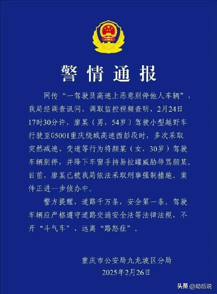 现在官方通报出来了:经调查讯问、调取监控视频查明,2月24日17时30分许,廖某(男,54岁)驾驶小型越野车行驶至G5001重庆绕城高速西彭段时,多次采取突然减速、变道等行为将颜某(女,30岁)驾驶车辆别停,并降下车窗手持易拉罐威胁辱骂颜某。