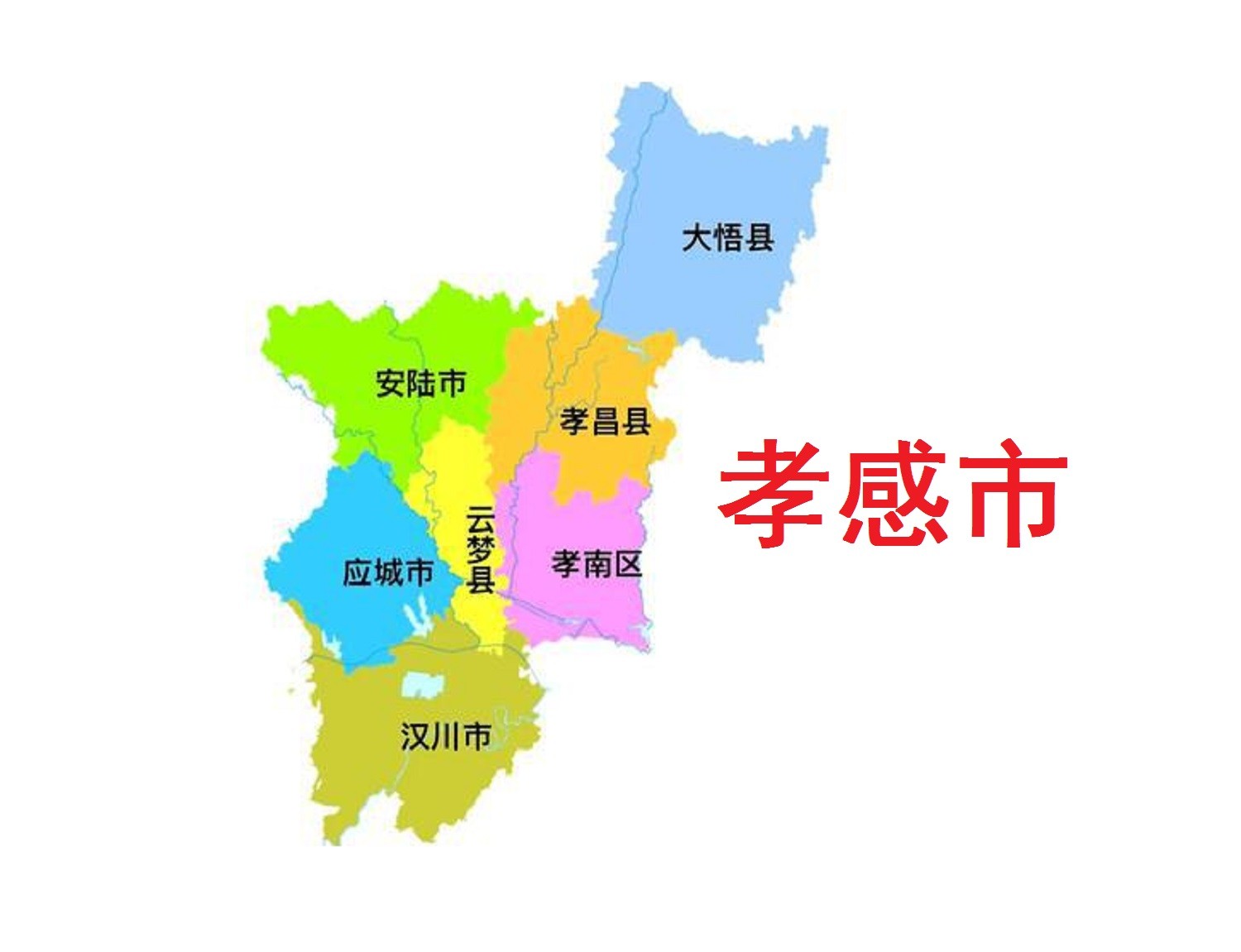 孝感市,市政府驻孝南区。地处湖北省东北部,东连黄冈市,东南与武汉市相连,西南与仙桃市毗邻,西接天门市、荆门市,西北与随州市搭界,北与河南省信阳市交界。
