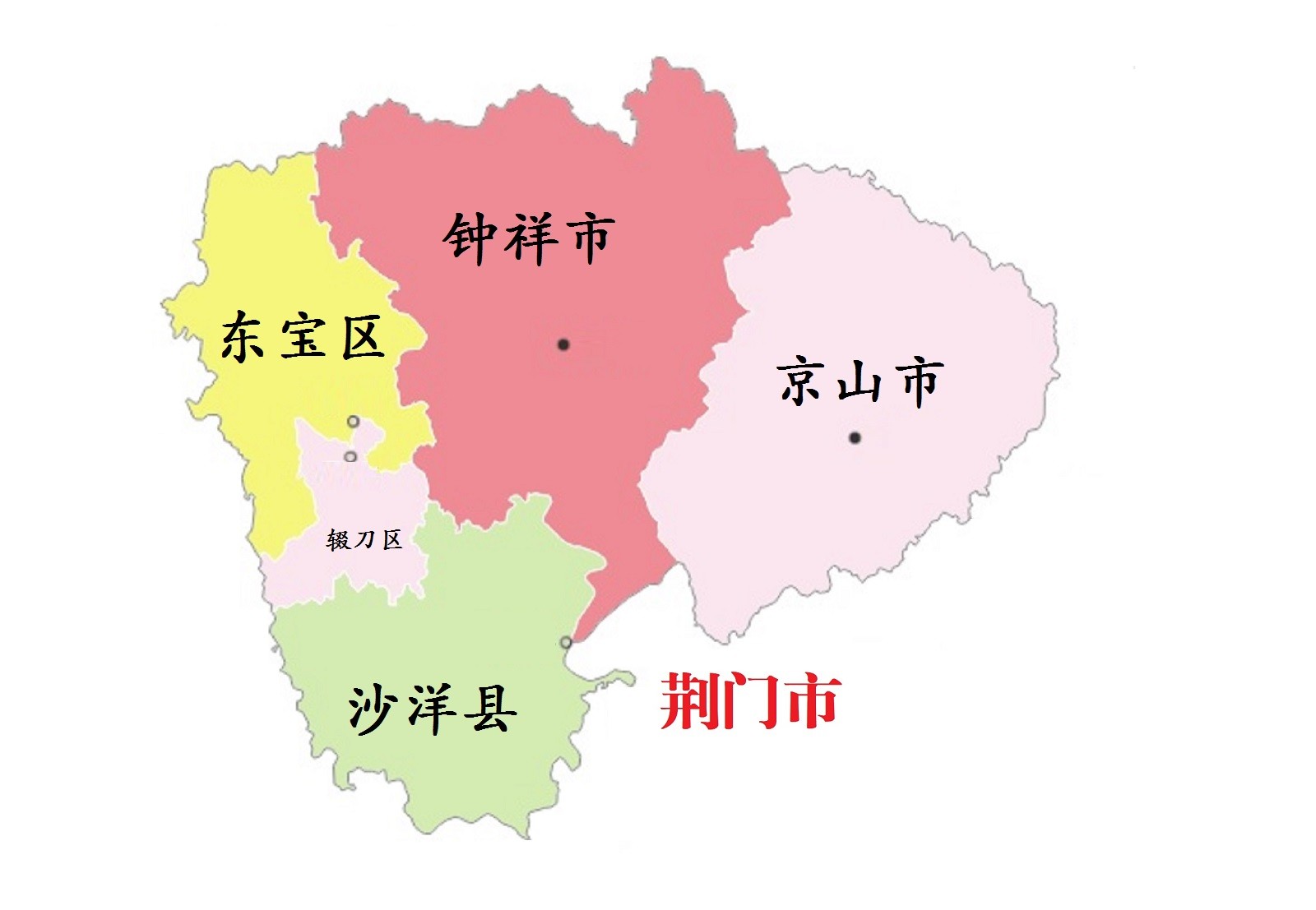 荆门市,市政府驻东宝区。位于湖北省中部,北与襄阳市、随州市相连,西与宜昌市毗邻,东与孝感市交界,南与荆州市、潜江市、天门市接壤。