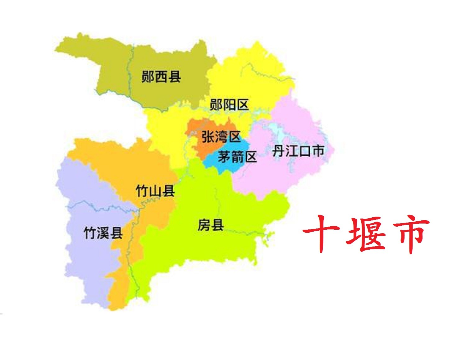 十堰市,市政府驻茅箭区。地处湖北省西北部,鄂豫陕渝4省市交界处,东与襄阳市毗邻,东北与河南省南阳市相连,北与陕西省商洛市县相接,西与陕西省安康市毗邻,南与神农架、重庆市搭界。