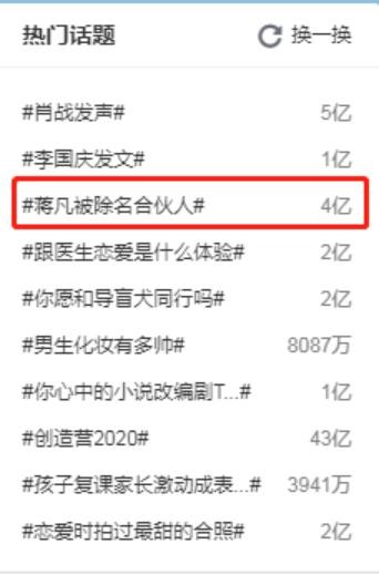 在微博热搜上,“蒋凡被除名合伙人”话题总阅读数超过4亿。