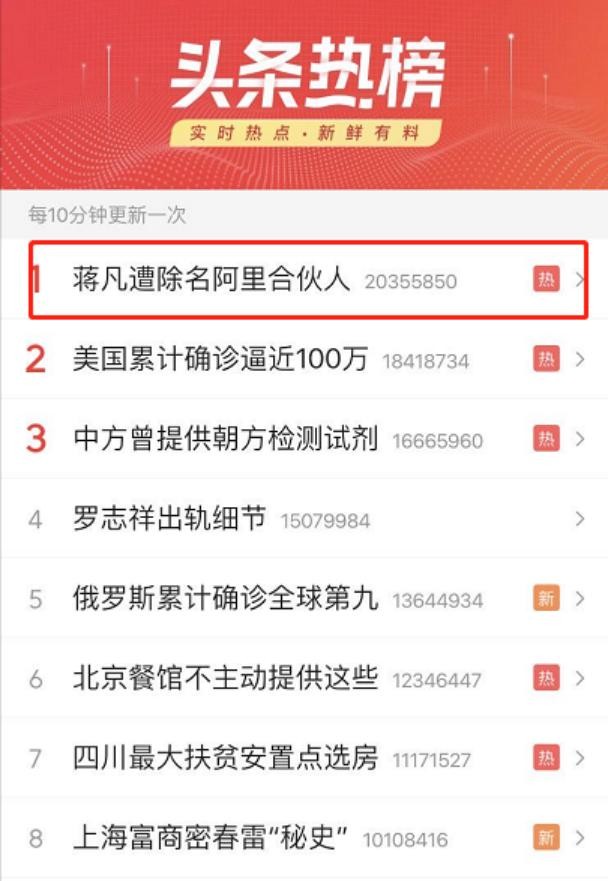 今日头条APP上,“蒋凡遭除名阿里合伙人”在热榜排名第一。