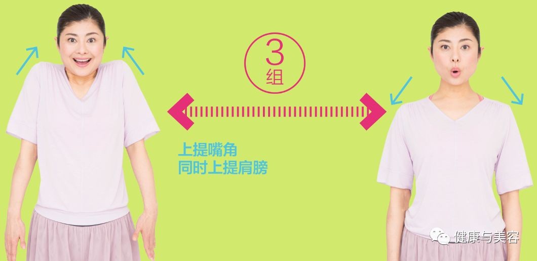 上提嘴角时,将肩膀尽量上提到较高位置,保持 3秒钟。下拉嘴角时,用力下拉肩部,重复3次。