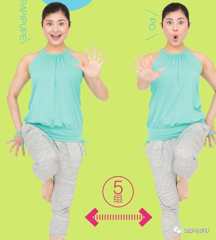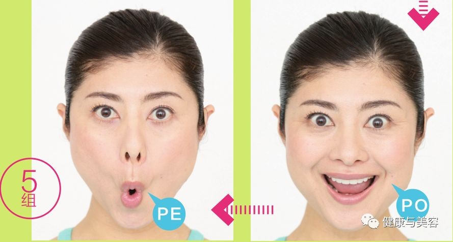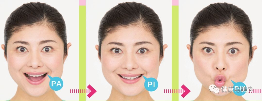 发音前先发“嗯”的声音将嘴唇内翻,想象嘴唇破裂的感觉,有节奏地重复发出“PA、PI、PU、PE、PO”的声音。运动嘴部时可以去除面部水肿,使面部线条变得棱角分明,同时原地踏步可以提拉腹部。