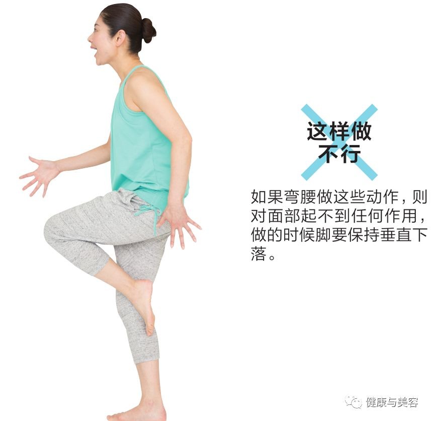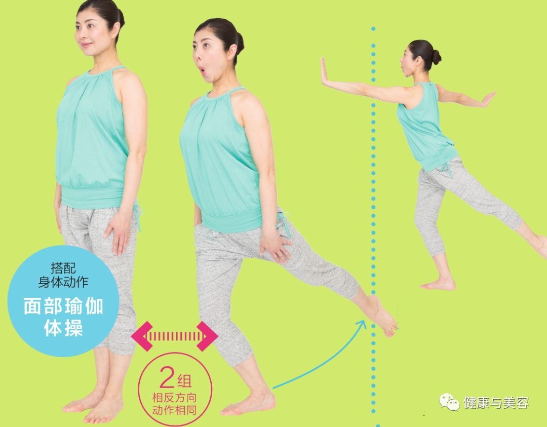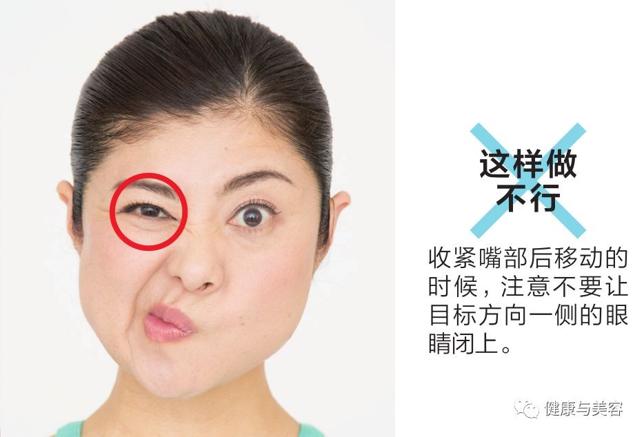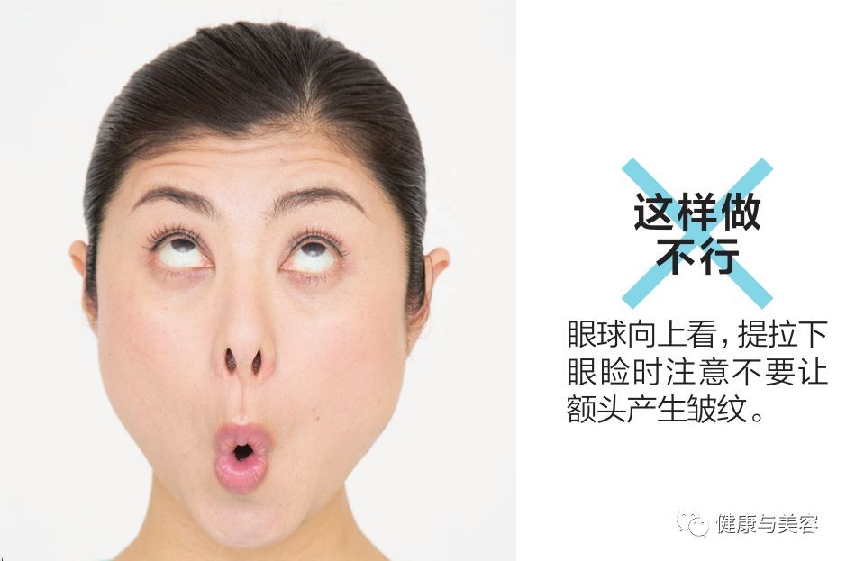这是一种配合面部眼球和嘴角上提下拉的动作,同时又上提下拉脚后跟的面部瑜伽体操,能够锻炼颊肌和眼轮匝肌。间间田女士说 :“越用力上提眼球越能使脸颊肌肉收紧。”对法令线很有效。上提眼球时如果额头出现皱纹,会变成表情皱纹,因此做动作时,应只使用眼周肌肉提拉眼球。