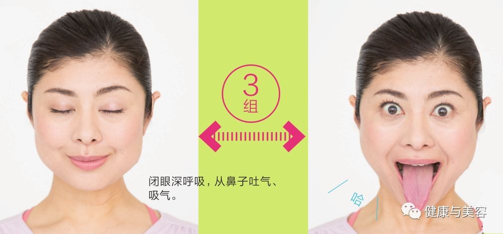 hihihihi一边呼气,一边横向拉伸嘴角,将面部筋竖起。伸出舌头,舌尖向上慢慢推两次。