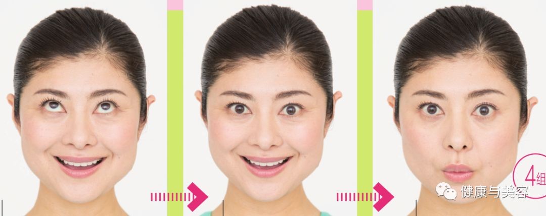 将面颊和嘴角用力上提,露出上排牙齿做笑脸状。保持笑脸向上提眼球。将黑眼球恢复到正面,保持嘴角上提。放松脸颊肌肉,放松嘴角使之自然下垂。