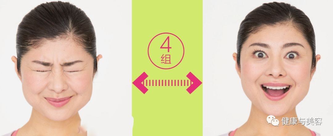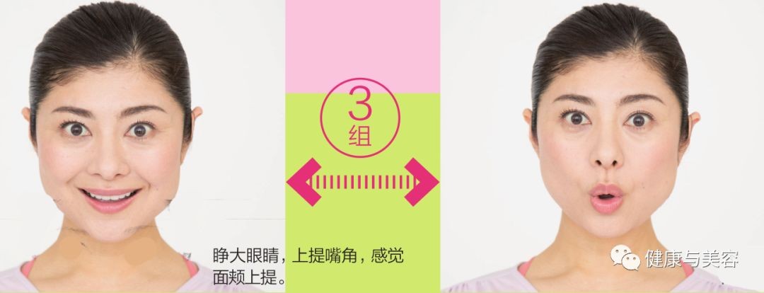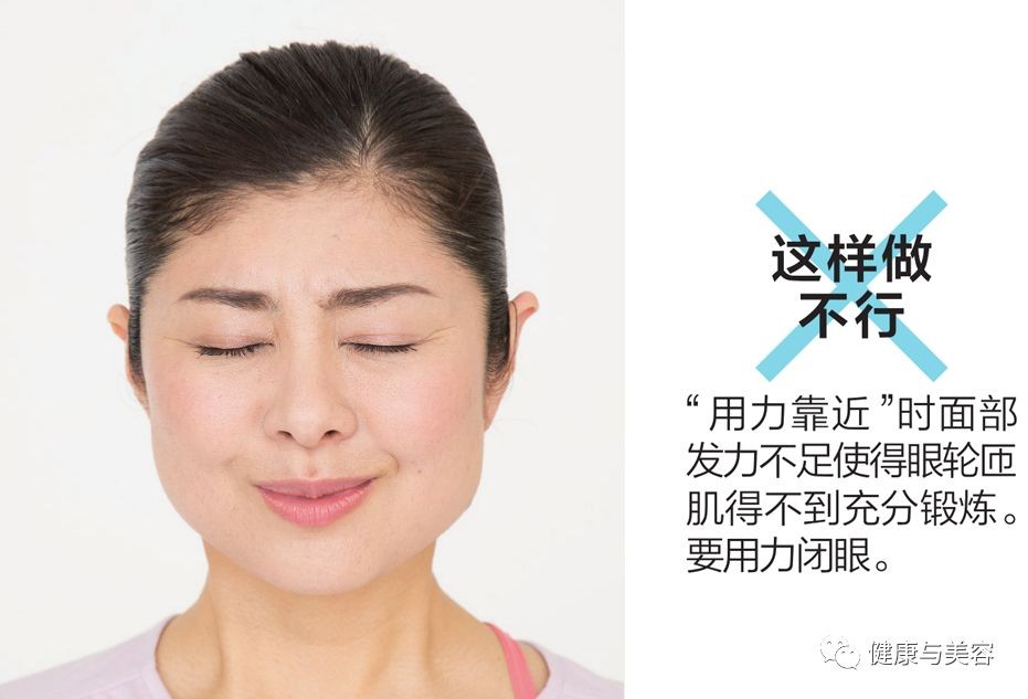 用力闭眼,就像要把眼球插入头部深处一样,注意眼周围尽量不要出现皱纹。充分放松,用力睁开眼睛。轻轻张开嘴,在睁眼的同时上提嘴角。