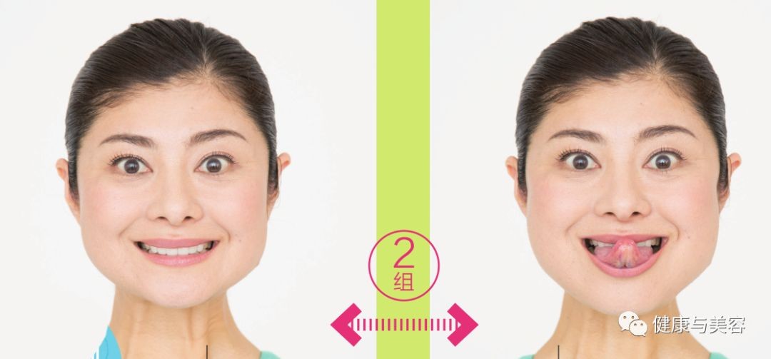 张开嘴,收紧嘴唇向前突出。将嘴唇向面颊左侧滑动,感受右侧面颊被抻拉的感觉。将嘴唇向面颊右侧滑动,感受左侧脸颊被抻拉的感觉。