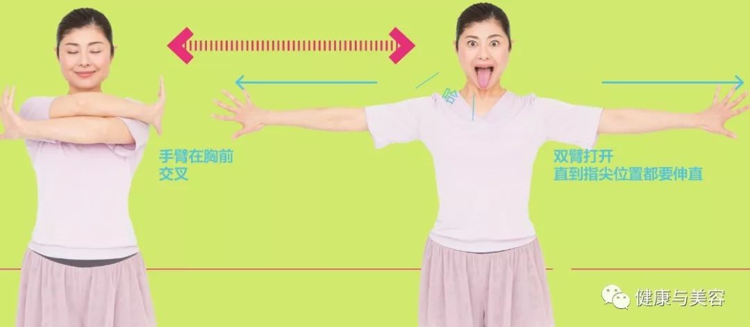 伸直背部,将手掌用力打开,手臂在胸前交叉,这时闭眼深呼吸。一边呼气,一边伸出舌头,同时伸开双臂,用力收紧两侧肩胛骨,重复3次。