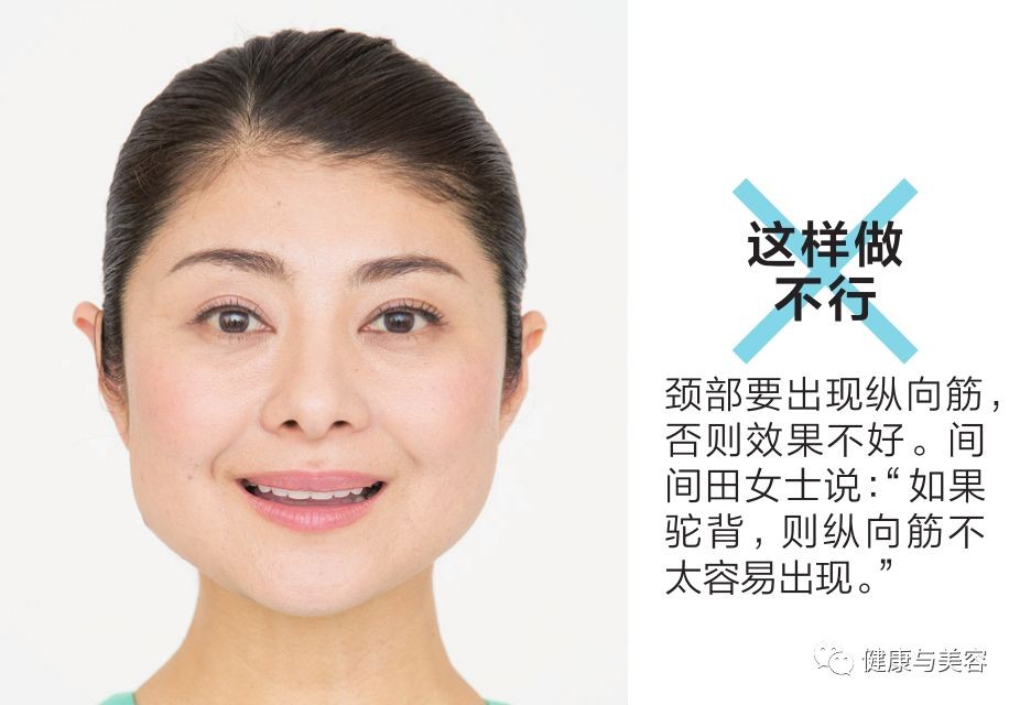 重点是呼气的时候将颈部的竖筋立起来,通过锻炼颈部的颈阔肌可以消除双层下巴和颈部皱纹。间间田女士说 :“筋如果没有立起来的话,难以作用到颈阔肌,会呈现出一种无力的状态,因此要多加注意。”