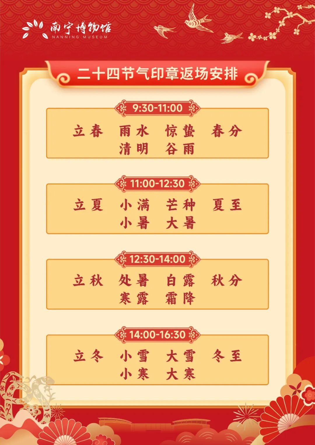 为方便广大观众到馆参观,现对2025年春节期间南宁博物馆、邓颖超纪念馆的开闭馆时间作如下安排:1月29日(初一)至2月4日(初七)开馆,1月28日(除夕)、2月5日(初八)闭馆。春节期间,南宁博物馆将开展新春主题活动,欢迎大家到馆参与!