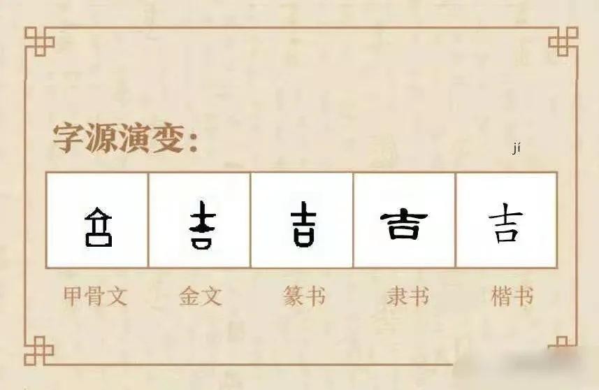 “吉”字:最早见于甲骨文,其本义是吉祥,吉利;后引申为善、贤、美等意思。