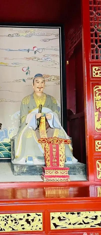 曾子主张以孝为本,内省慎独,修其治平,参予编制《论语》,著《大学》、《孝经》、《曾子十篇》等作品,构成—套上承孔学,下开思孟学派的完整的道德伦理政治哲学体系,在儒家发展史上占据重要的地位,被后世尊为“宗圣”,成为配享孔庙的四配之—。如下图所示: