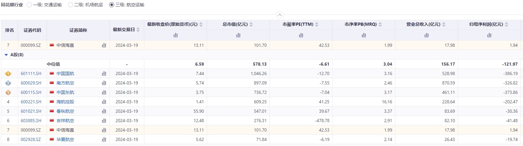 除此,勉强可以将航空运输行业的相关数据进行对比:中信海直的市值排名第七,总市值103.80亿元。低于中位值的578.93亿元,但利润却是所有公司里面的number1 ,这和航空公司的特性有一定关系,比如:重资产、固定运营成本高、产品同质化,容易受到宏观经济影响等,具体的本视频就不赘述了。总之呢,中信海直和一般航空公司的服务对象都是有很大的差异。市面上总有人拿旅游业的相关指标来说中信海直,我只能说,有时候主营产品和所属行业并非完全吻合的。投资者们需要更加的细心。