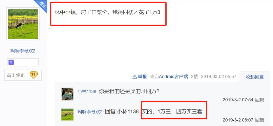 还有一位网友选择到大兴安岭隐居,花1.3万在林中小镇买了个4层小楼房,没事可以上山采山货补贴生活。