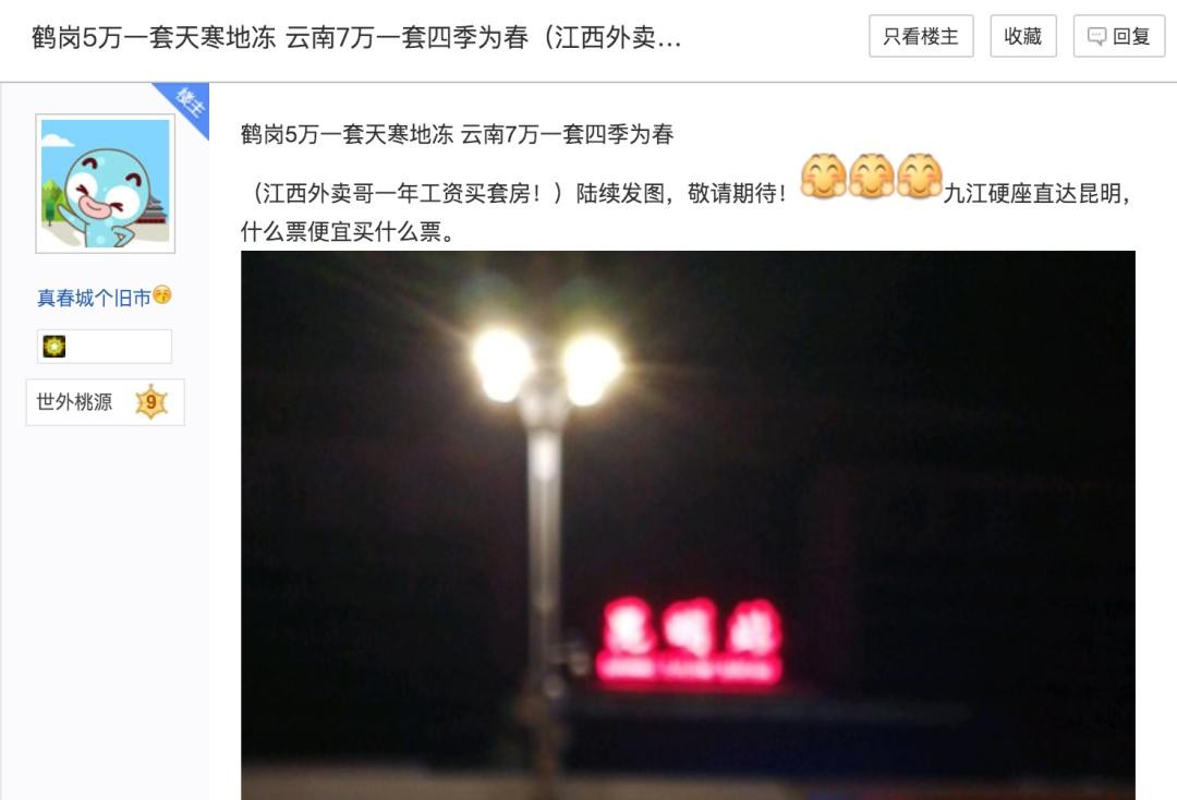 他在百度隐居吧里开了一个《鹤岗五万买房天寒地冻,云南七万买房四季如春》的帖子。