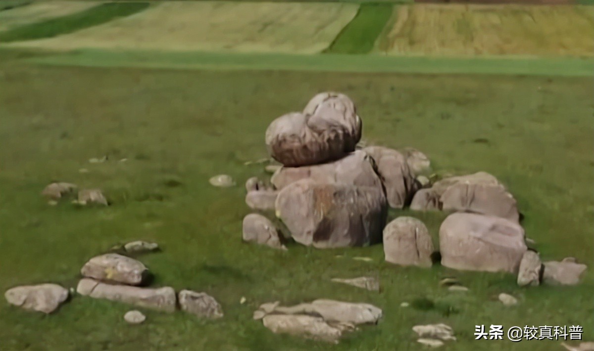 在这片平坦的原野上,有许多大块的石头堆放在一起,这些不规则的石头就像是被随意堆放在这里的一样。