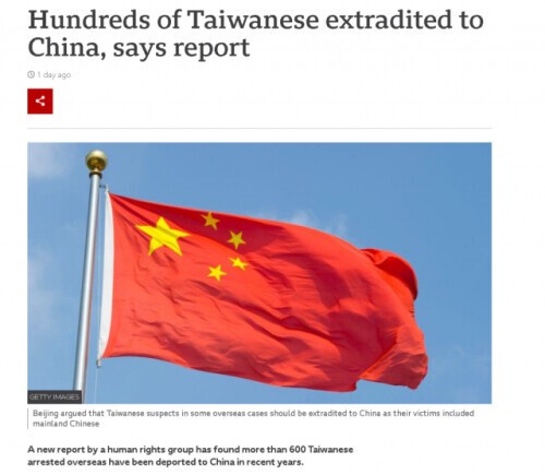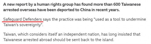 如上图所示,BBC在这篇看似是在关心“台湾人人权”的文章中宣称,过去这些年600多名生活在海外的台湾人,都被中国政府“抓”到大陆去了,并称这不仅会侵犯这些人的人权,还会伤害台湾的“主权”。