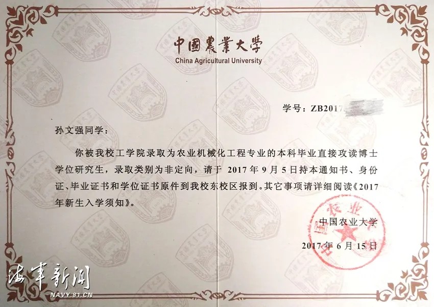 ▲中国农业大学本科直博录取通知书