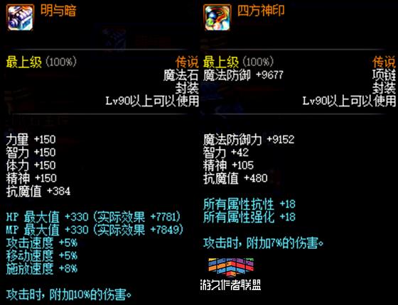 最后是防具外的两件无冲突传说装备,明与暗右槽价格600万左右,属性亮点是少量三速,150四维和10%附加伤害。四方神印项链价格200万左右,属性亮点是18点所有属强和7%附加伤害。