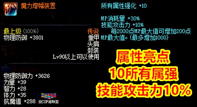 90级重甲头肩魔力增幅装置,价格在300万左右。属性亮点方面是10点所有属性强化和10%的技能攻击力,众所周知90版本新增了许多词条,而技能攻击力是所有词条中最强的属性,因为技能攻击力的算法是乘算的,不存在稀释一说,不过艾格尼丝搭配荒古圣耀是一个例外。