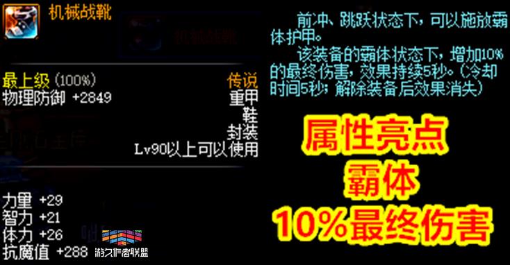 90级重甲鞋机械战靴,价格190万左右。属性亮点方面是前冲和条血状态下进入霸体,触发该装备霸体效果时能增加10%最终伤害,持续和冷却时间是5秒。这个鞋子还是挺不错的,全程触发10%最终伤害,还有霸体效果。