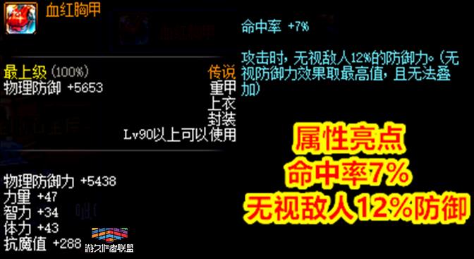 90级重甲上衣血红胸甲,价格200万左右。属性亮点方面是命中率+7%,无视敌人12%的防御力。无视防御力的装备属性虽然有冲突,但是当前版本关于这类型属性的装备还很少,重点是在7%的命中率,对于刚刚用十周年跨界石跨界了无用的玩家来说是不错的选择。另外无视防御力的算法是,假设怪物有100防御,然后无视12%后就是怪物还有88防御,具体能提升多少要研究生学历的勇士才能计算。