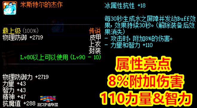 90级皮甲上衣米斯特尔的杰作,价格在200万左右。属性亮点方面是每30秒可以触发水之屏障的buff特效,这个特效的持续时间是30秒,冷却又是30秒,换句话说就是无限触发,特效的属性是8%白字伤害和110的力智加成。