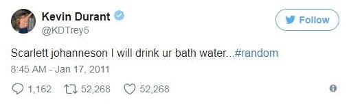 2011年1月,NBA球星杜兰特在社交平台发了这么一条动态:斯嘉丽,我要喝你的洗澡水。