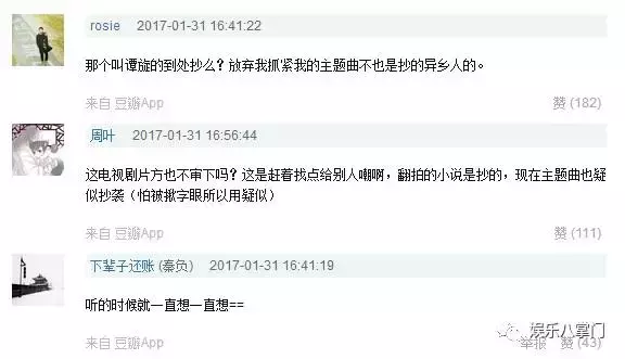 而作曲人谭璇以前就被爆《爱的供养》抄袭,《放弃我抓紧我》的主题曲也涉嫌抄袭《异乡人》