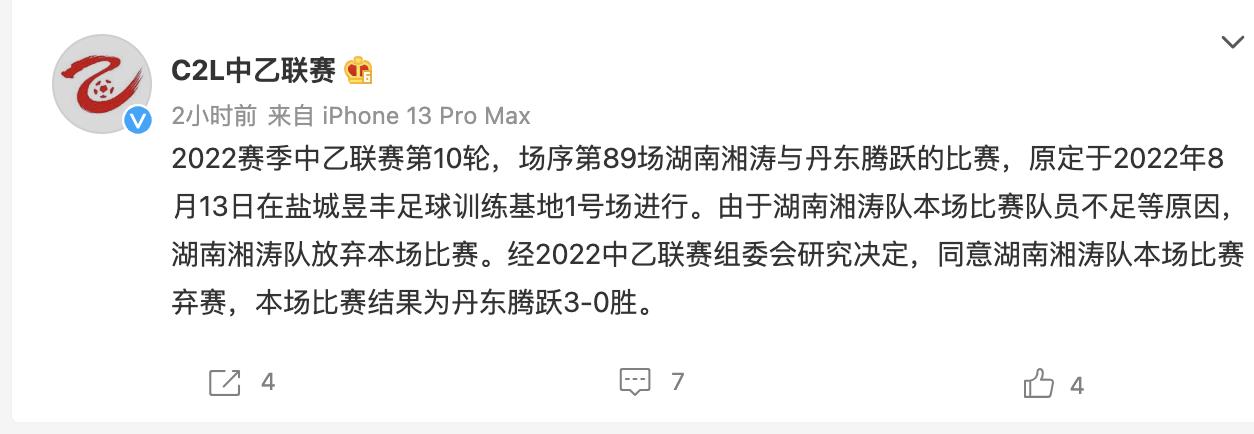 北京时间8月13日,中国足坛继续将笑话演个不停,中乙联赛官方宣布,中乙第10轮联赛,湖南湘涛继续因为人员不齐整放弃比赛,这是湖南湘涛连续3轮比赛弃赛了,放眼世界足坛任何联赛,只怕也只有中国足坛闹这种笑话了。