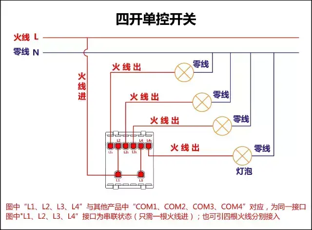 三、 四开连体单控开关接线图