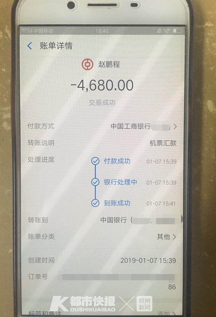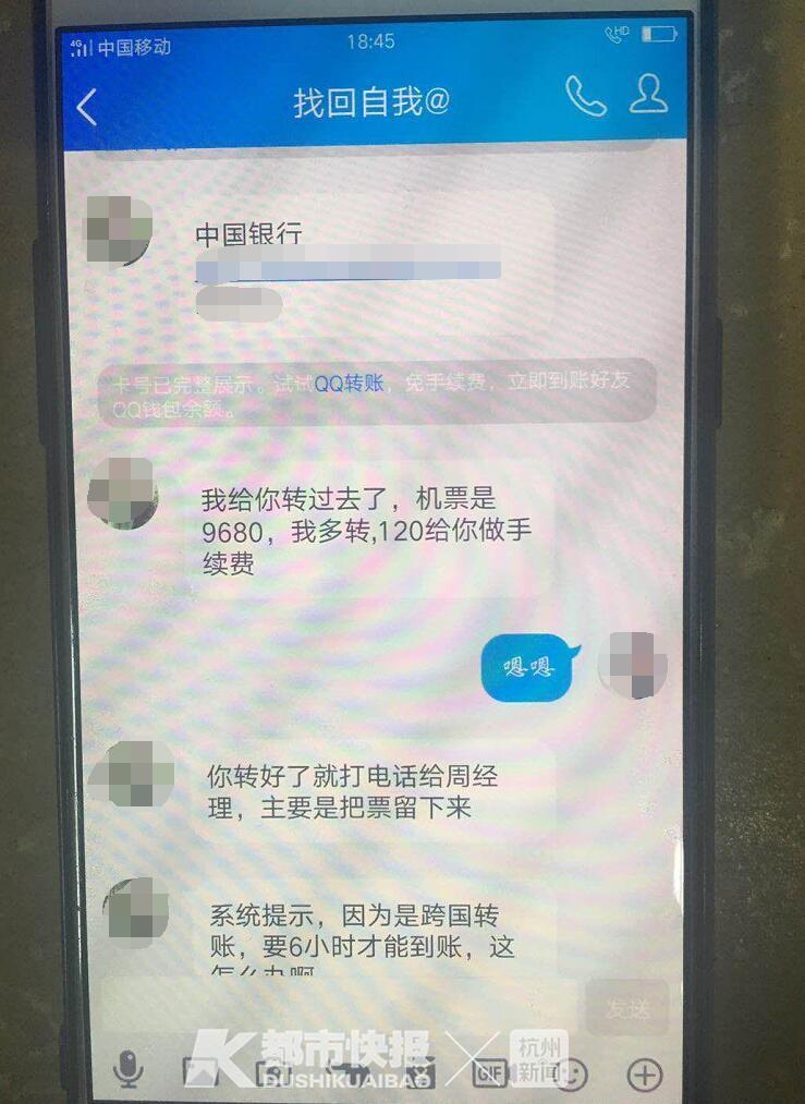老乡称,由于是跨国转账,要6小时才能到账,让陈女士先将买机票钱转到另一个人的账户上。