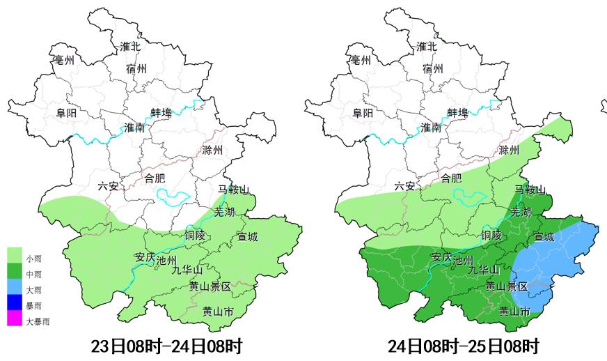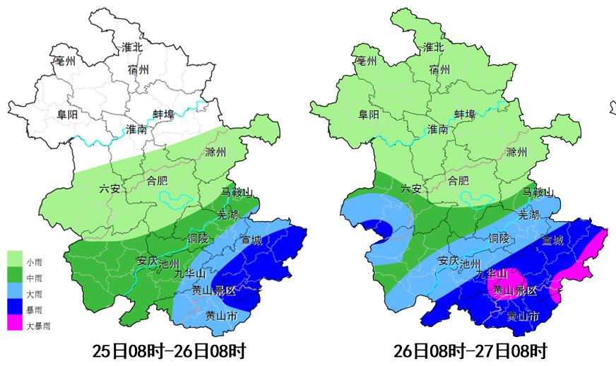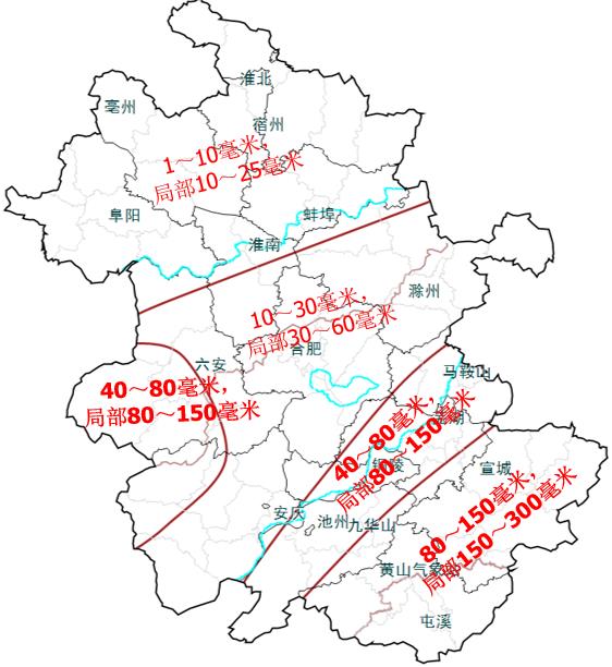 23-26日累计降水量:宣城、黄山、芜湖和池州南部80~150毫米,局部150~300毫米;沿江和大别山区40~80毫米,局部80~150毫米;淮河以南其他地区10~30毫米,局部30~60毫米;淮北地区1~10毫米,局部10~25毫米。