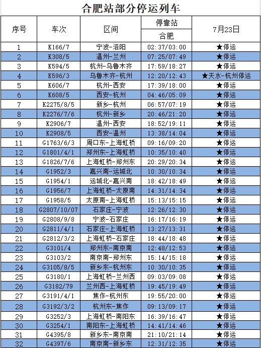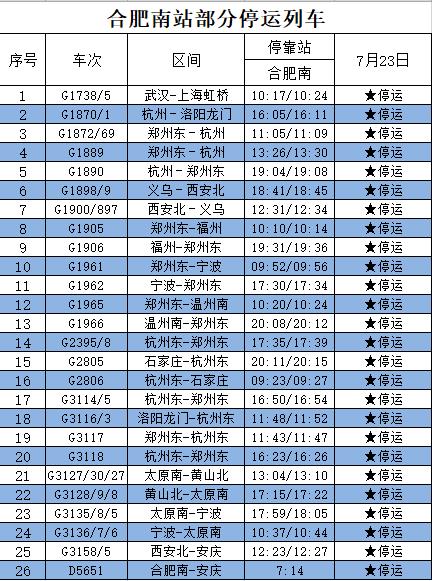 7月23日,受郑州水害以及台风“烟花”影响,合肥站和合肥南站多趟列车停运,目前梳理了部分停运列车车次信息。铁路部门提醒旅客,停运、折返等列车调整开行相关信息,请以车站公告为准,若有疑问可致电铁路客服热线021-12306咨询。