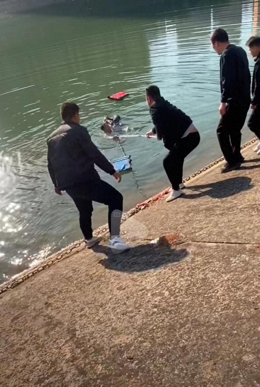 王女士提供的视频内容显示,张先生够到孩子后,用左手托着对方的头,试图往岸边游。一名路人递来一根长棍,让朋友们用棍子把两人拉了上来。