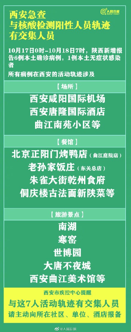 在此,西安市疾控中心提醒与这7人活动轨迹有交集人员,请主动向所在社区、单位、酒店报备;广大市民和游客,坚持扫码、测温、戴口罩等常态化防控措施,勤洗手、多通风、不聚集、保持社交距离,积极配合政府落实各项防疫措施。继续坚持非必须不出境、不出省,不去中高风险地区、旅游热点地区旅行或出差,积极接种新冠病毒疫苗。如出现发热或呼吸道症状,应及时就医。