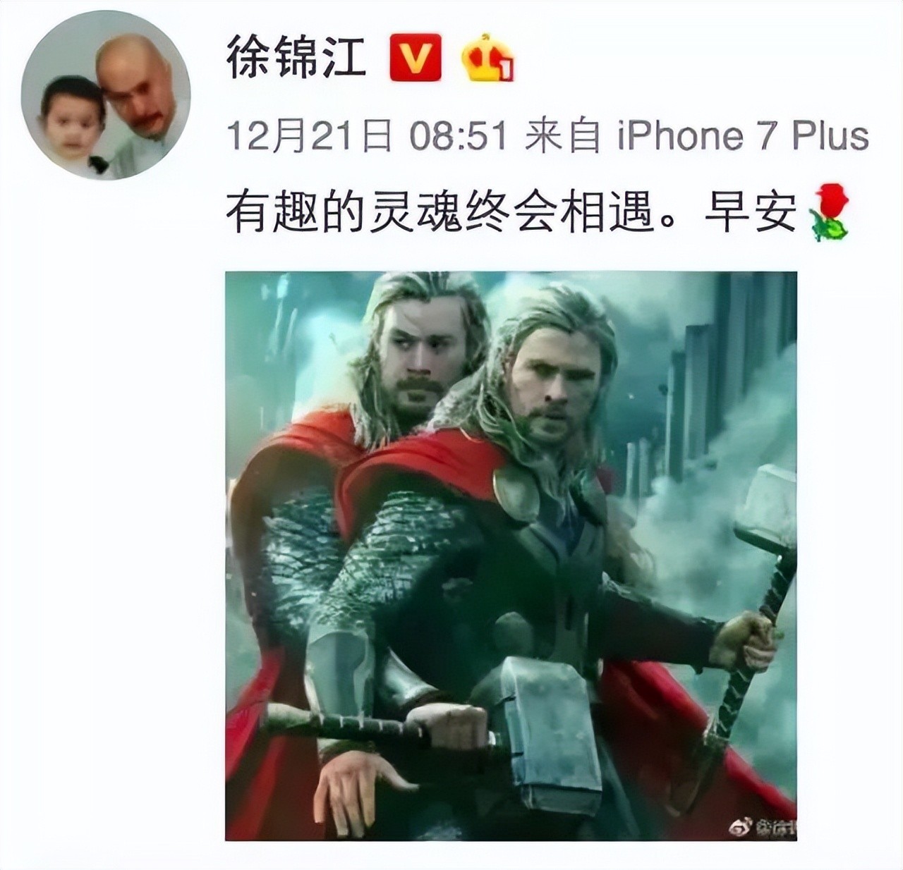 撞脸雷神,他发微博称:“有趣的灵魂终会相遇”,