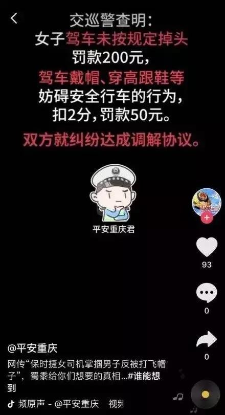 30日19时左右,@平安重庆 抖音及微博发布消息称,交巡警查明:女子驾车未按规定掉头,罚款200元,驾车戴帽、穿高跟鞋等,妨碍安全行车的行为,扣2分,罚款50元。双方就纠纷达成调解协议。