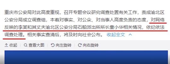 本着对事实、对公众、对当事人高度负责的态度,对网络反映的李某及其丈夫渝北区公安分局石船派出所所长童小华的相关情况,依纪依法调查处理。相关事实查清后,将及时向社会公布。