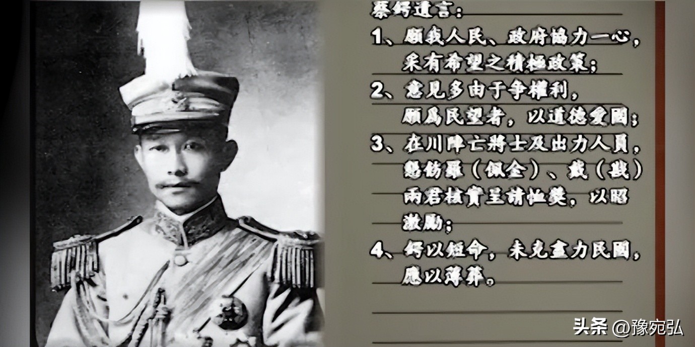 民国五年(1916年)11月6日晚,医生为蔡锷打了一针强心剂,使其精神顿爽,于11月7日口授随员四事,作为遗嘱,于第二天(8日)给北京政府发了电报。其内容如下:国会、大总统均鉴:锷病恐不起,谨口授随员等以遗电陈四事:一、愿我人民政府,协力一心,采有希望之积极政策,以建设好国家。二、现在各派意见多乖,竞争权力,愿为民望者以道德爱国,勿谋私利。三、此次在川阵亡及出力人员,恳饬罗督军、戴省长核实呈请恤奖,以昭激劝。四、锷以短命,未能尽力民国,应为薄葬。临电哀鸣,伏乞慈鉴。四川督军兼省长蔡锷叩。蔡锷病逝于福冈医院,临终遗嘱中没有一句提及私事。